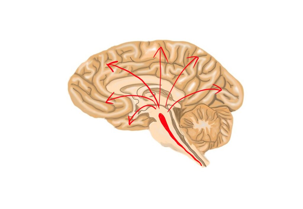 RAS(網様体賦活系)は脳のこの赤い部分にあり、矢印のように広がってます。